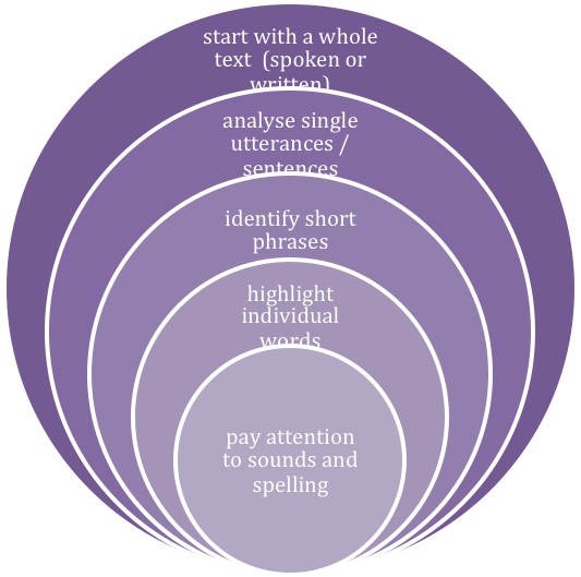 and finally to longer spoken or written texts. In this approach it