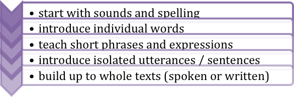 There is something about the order that seems logical, as if you are building up the blocks of language. It appeals to people for this reason. It is important for language learners to understand these separate components of the language, but it is not the best or only way to start to teach a language. Language teachers also take an analytic approach. That is, the teacher often turns the order on its head, and presents a whole spoken or written text to the students first up. All components of the language are presented together in context, even though the students may not understand every word at first.